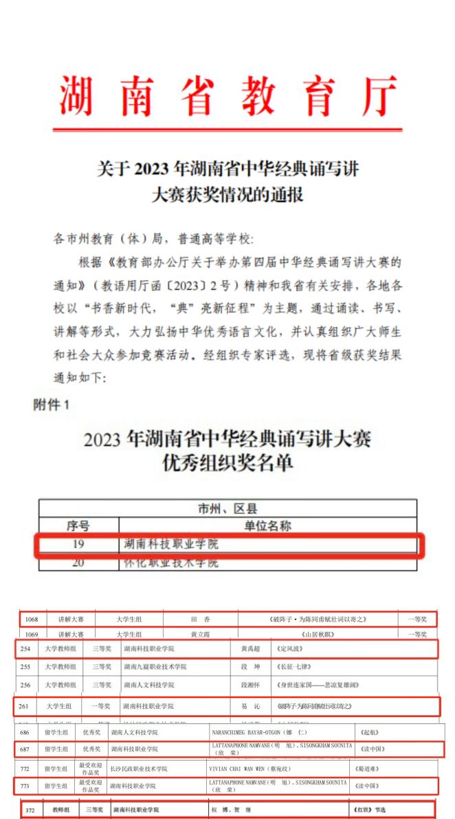 近日,湖南省教育厅下发《关于2023年湖南省中华经典诵写讲大赛获奖情况的通报》。我校荣获省中华经典诵写讲大赛 “优秀组织奖”。一举斩获一等奖1项、三等奖3项、优秀奖和最受欢迎作品奖各一项。
