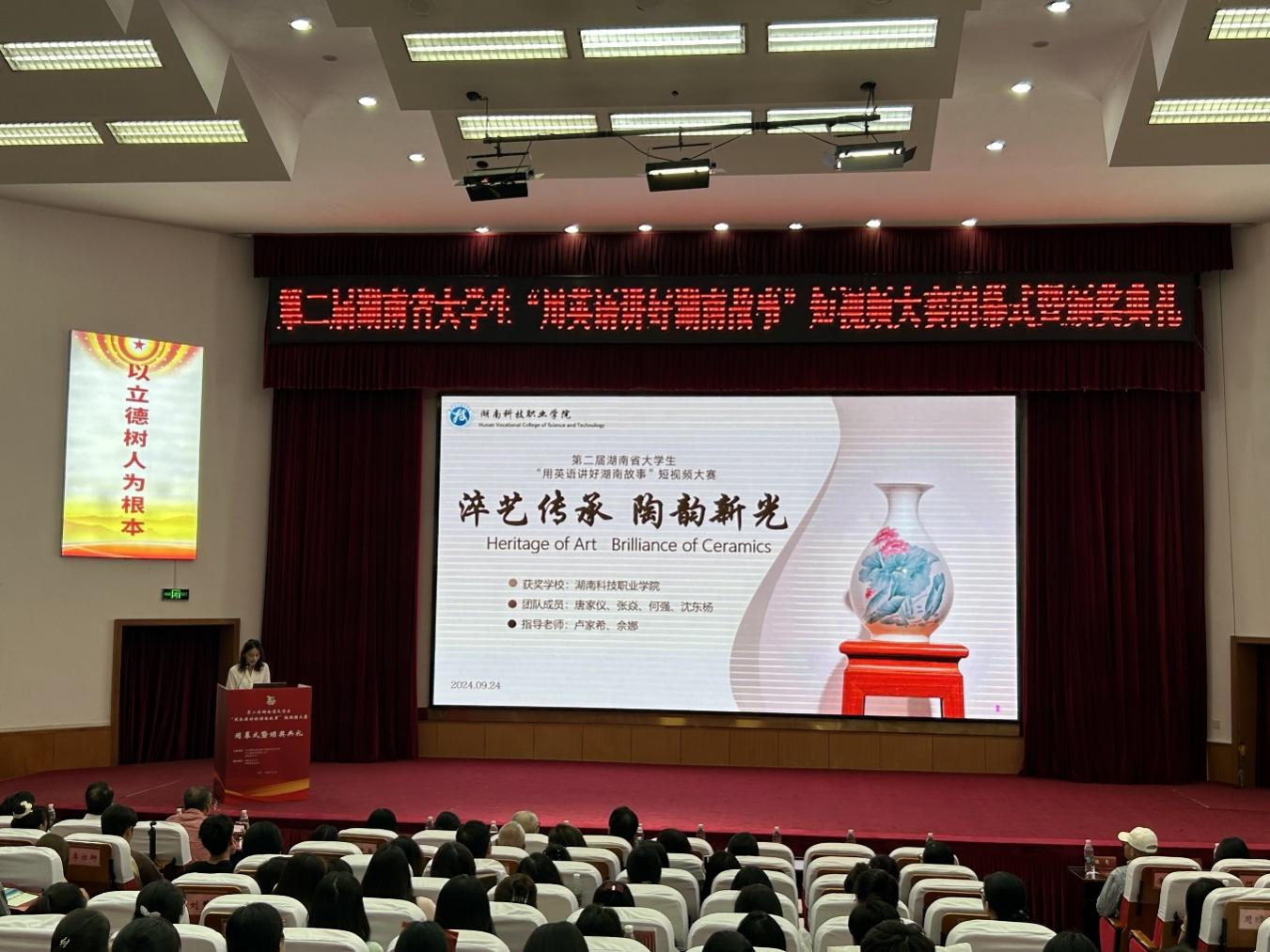 9月24日,湖南省第二届大学生“用英语讲好湖南故事”短视频大赛闭幕式暨颁奖典礼在湖南农业大学举行。我校素质教育学院外语教研室卢家希、佘娜老师指导学生唐家仪、张焱、何强、沈东杨拍摄制作的短视频作品《淬艺传承•陶韵新光》荣获高职组一等奖第一名,并代表2所高职院校之一应邀在颁奖典礼上进行作品创作分享。