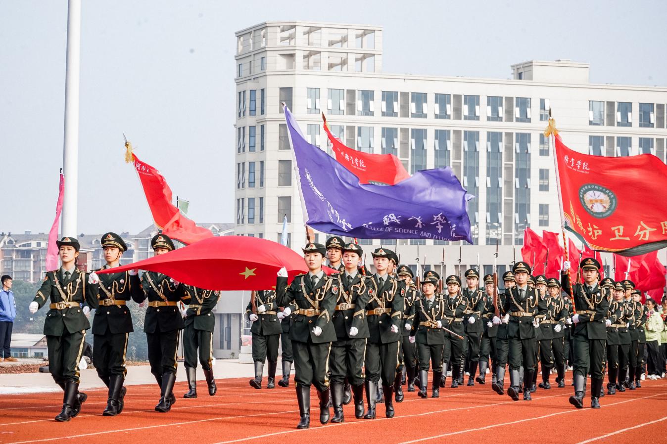 开幕式伊始,国旗护卫队和校旗方阵迈着矫健的步伐率先入场。