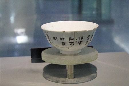 (吉鸿昌使用过的瓷碗。上面烧制着吉鸿昌父亲的遗训:“作官即不许发财”。)