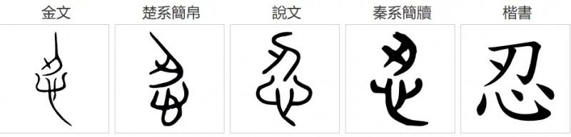 忍字见于《说文解字·心部》,解释为“忍耐”的意思。“能也”,“能”是熊一类的动物,能兽里面的骨节坚实,引申为能力强,所以有“贤能”一词,能兽强壮,所以强壮的人称“能杰”。忍耐包括行为的行止两方面,能忍住不做事的冲动称之为忍,所以有“忍害”一词,能忍住做事的冲动也称之为忍,所以有“忍耐”一词。