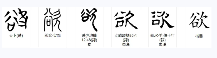 据段玉裁《说文解字注》:“欲者衍字。”可知上引《说文解字》原文应是“欲,贪也。”即与“贪”同义,而《说文·贝部》:“贪,欲物也。”所以“欲”是“想要得到”的意思。据李守奎先生的观点,“欲”字或许是从谷、从㳄省的会意字。其本义表示心中对于所想之物的贪恋,欲望由心底所发,是因心有所需、情有所好而致。但若是控制不住自己的欲望,任其膨胀,必会自取灭亡。